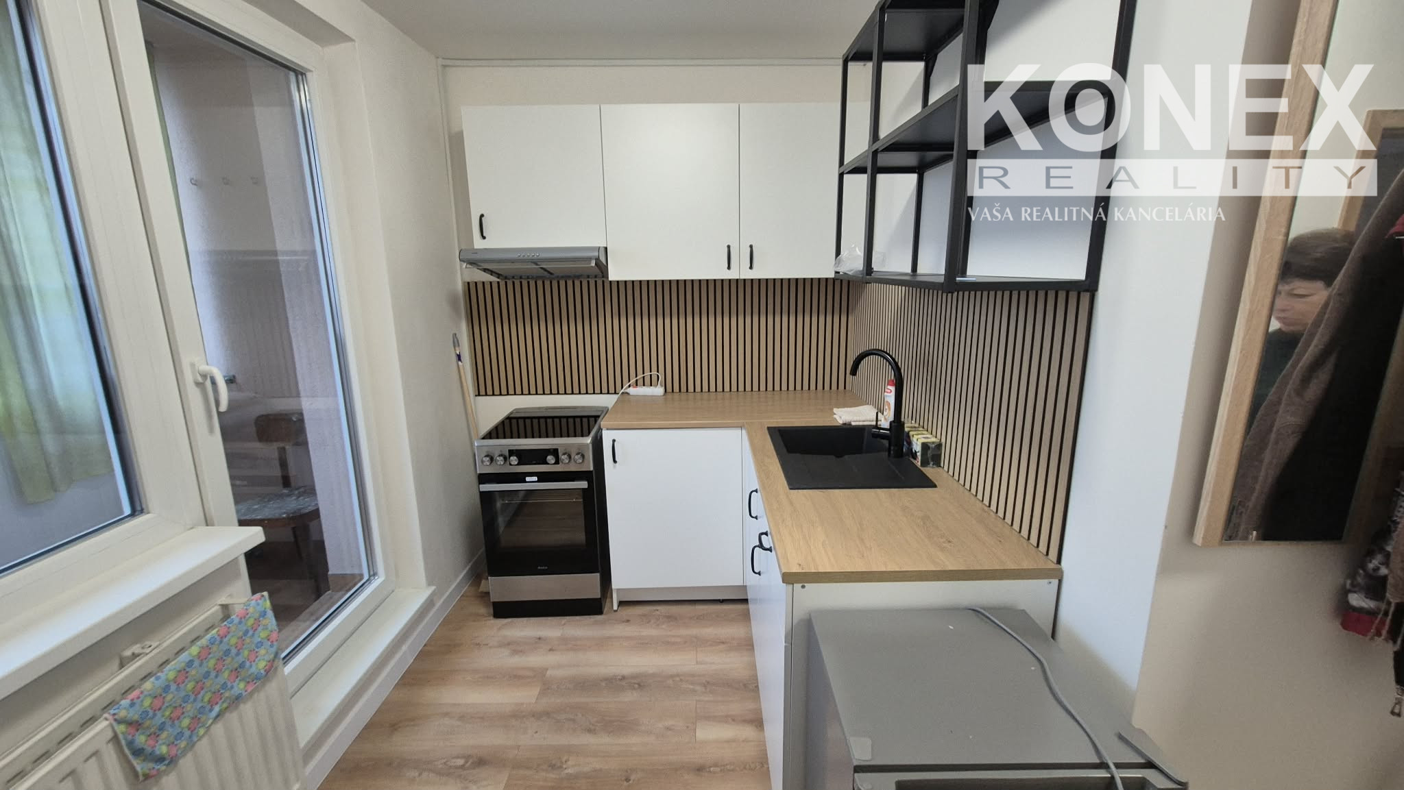 disponuje priestranným balkónom, novou kuchynskou linkou s digestorom, sporákom s rúrou, chladničkou, práčkou a s veľkým sprchovacím kútom, + vstavaná skriňa a posteľ,